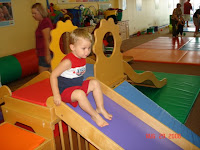 He loves playing with the balls. He rolls them down any ramp he can find. The runs after the bubbles they blow during the class. He found a rocky horse that is not as good as his horses at home, but it will do.